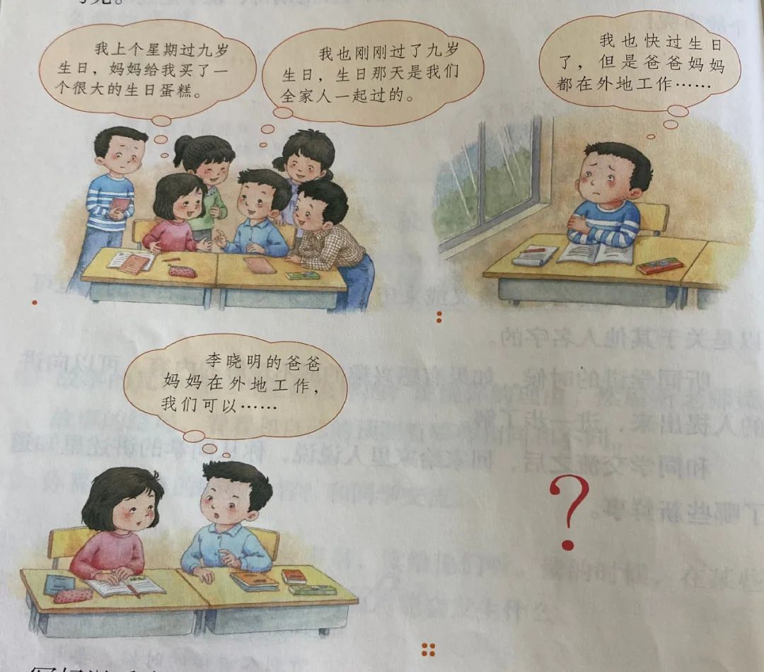 图二:李晓明生日快到了,但父母在外地工作,他认为这个生日可能没人给他过了,很难过。