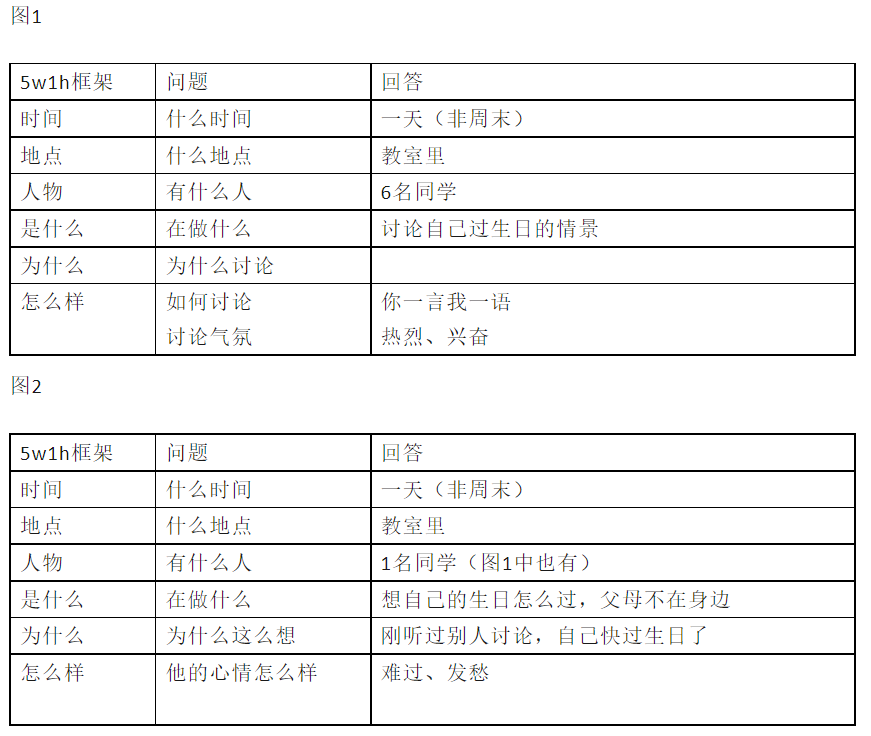 看图写话先把每幅图写几句话,本次习作思路采用5w1h框架来写每一幅图(即时间、地点、人物、是什么、为什么、怎么样)